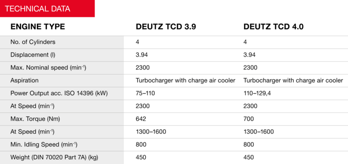 Developed in Germany and manufactured to the highest quality standards, the TCD 3.9/4.0 stands for reliability and durability – day after day. Long oil change intervals (up to 1000 hours) and maintenance-free valves and belt drive reduce operating costs and increase availability. Global DEUTZ service and worldwide spare parts supply ensure maximum availability.
